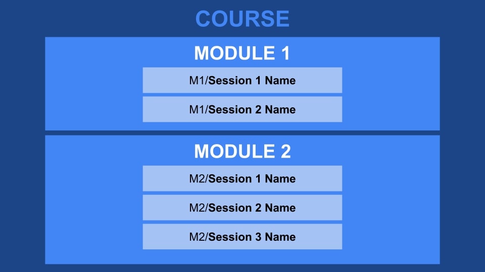 - Modules 2–8: Core content (2–4 sessions per module)